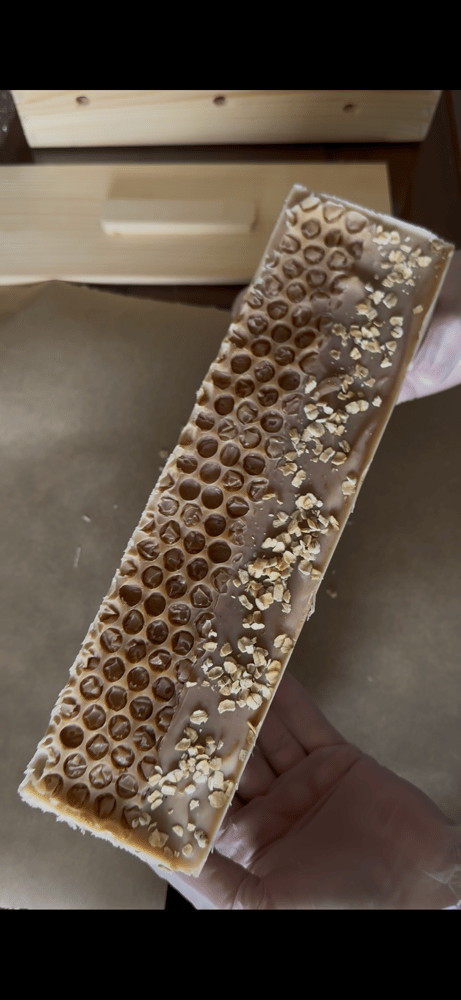 Ingredients: Saponified with olive oil, coconut oil, grass-fed tallow, and castor oil; blended with fresh goat milk, distilled water, finely ground oats, and raw honey